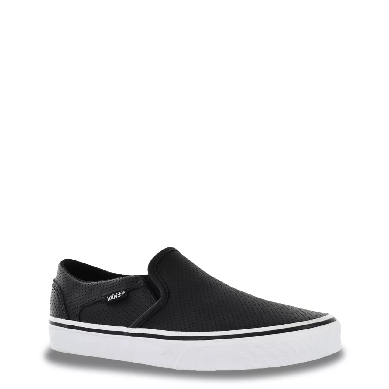 Step into a world of comfort wearing the women's Vans black and white Asher slip-on sneakers. Featuring a leather upper, these slip-ons have elastic goring on each side, a breathable textile lining, a comfy cushioning footbed and a contrasting rubber outsole with a reliable grip.